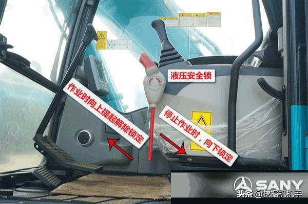 当打开挖掘机的车门时,就能看见它。“安全锁”顾名思义,就是考虑到驾驶员的安全而设计的。由于挖掘机的动作是通过液压传动的,安全锁能够及时控制液压的传动。