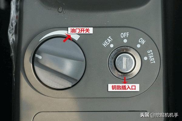 发动机启动开关,其实就是插入钥匙启动挖掘机的位置。上面有一些标识: