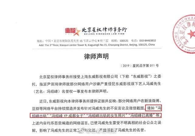 近日有网友爆料称冯绍峰已经和赵丽颖离婚,而冯绍峰工作室亲自澄清没有出轨之后,却又被曝出疑是冯绍峰出轨女生的照片,面对谣言四起的“出轨,离婚”风波,冯绍峰本人终于不再忍,将造谣者一一采集证据告上法庭。8月12日冯绍峰公司委托律师所发布律师声明,连日来营销号造谣爆料称“冯绍峰出轨”“冯绍峰YP成都女子”“冯绍峰出轨女生照片”“冯绍峰已离婚”等不实谣言严重损害了冯绍峰的名誉权,影响到了冯绍峰的个人生活和工作。对此冯绍峰通过律师事务所,严厉谴责针对冯绍峰的谣言,也呼吁网友希望不要在传播这种不实际的消息,另外警告发布诽谤信心的账号,对于侵权内容冯绍峰已经委托事务所调查取证完毕,不久将会启动诉讼程序。网络并非法外之地,赵丽颖休养停工一年与冯绍峰生下宝宝,两人本是被祝福的一对,赵丽颖即将在8月复工,希望赵丽颖复工前他们能够幸福的生活,不被流言蜚语打扰。