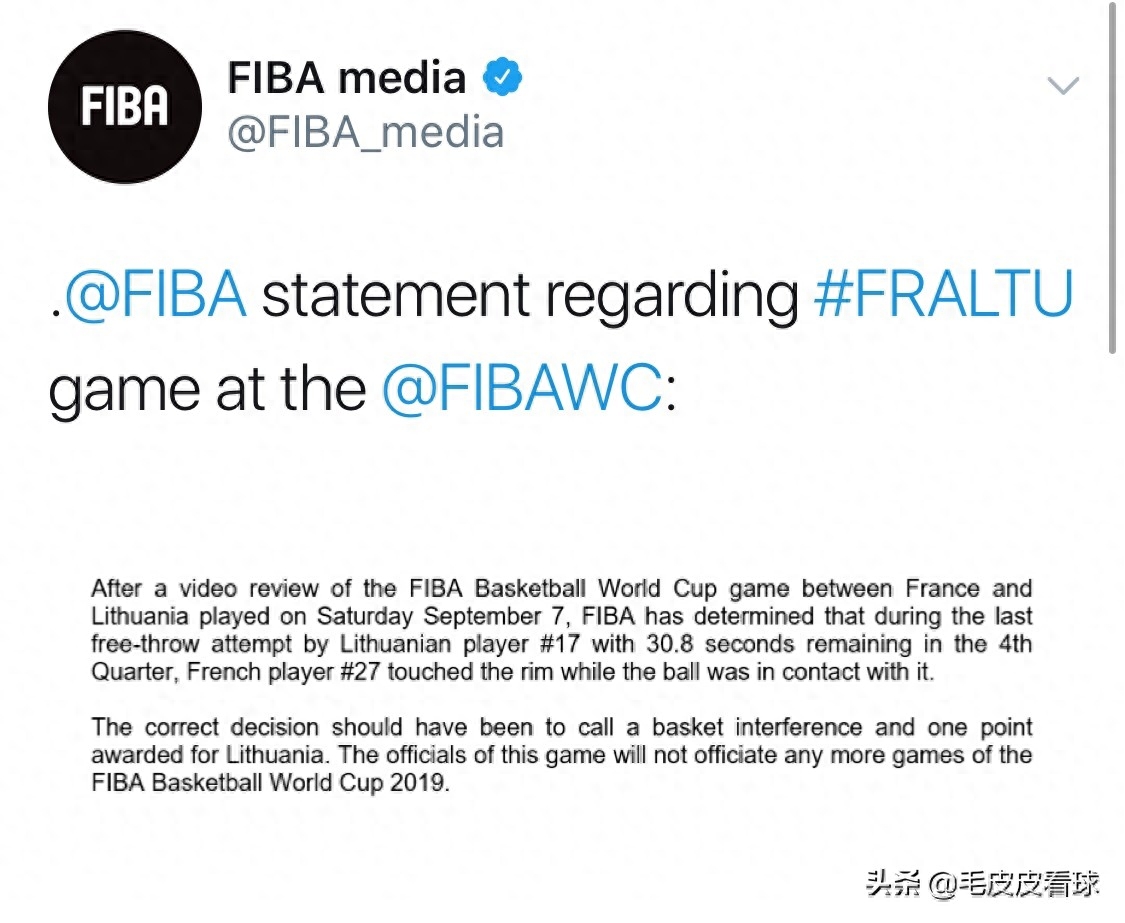 次日,FIBA官方在社交媒体上对这次判罚做出了回复,承认这是一次错误判罚,应判法国队进攻干扰球,立陶宛队得分有效,当职的三名裁判将取消接下来世界杯比赛的执法资格。但是,对于立陶宛来说,结果并不能更改,赛后瓦兰丘纳斯的眼睛里一直有泪水在打转。对于这些代表国家参赛的运动员来说,胜负不仅关乎个人,更关乎一个民族的荣誉。在比赛最后时刻,依靠球员来决定胜负,一直是篮球比赛中所强调的,而这次裁判的误判直接导致一个国家出局,裁判们的确需要好好反思了。