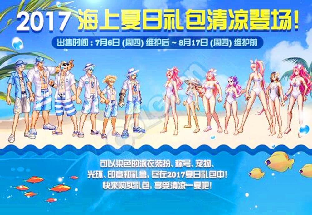 18年也就是即将更新的夏日套,走的是热舞路线,男性角色的话,统统露上身,看起来非常霸气,魔枪士依然最棒。再加上枪剑士的加入,礼包加入的东西更加完善,女性角色的话,个人觉得但从时装来说,比较一般。