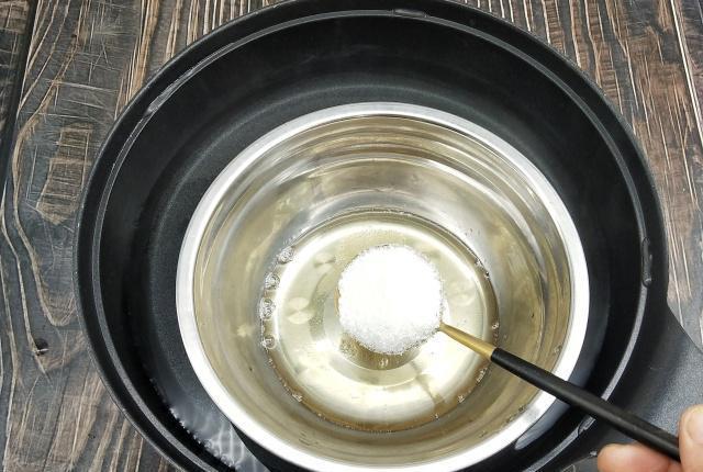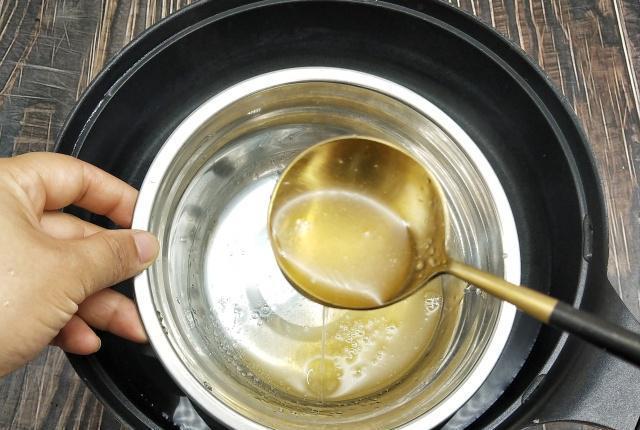 5、把锅里坐水烧热,隔水加热到吉利丁片融化成水,这个时候再加入白糖