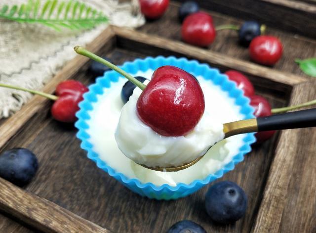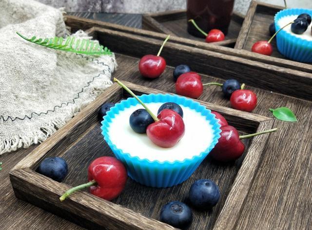 9、放入冰箱冷藏两个小时,等它凝固了,取出来,放上车厘子,蓝莓装饰,或者是个人喜欢的水果就行了,嫩滑q弹的口感,吃不完继续放冰箱冷藏哦,温室放久了会化的呢