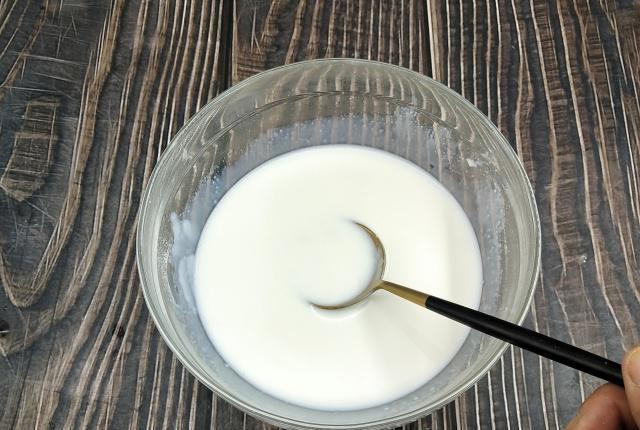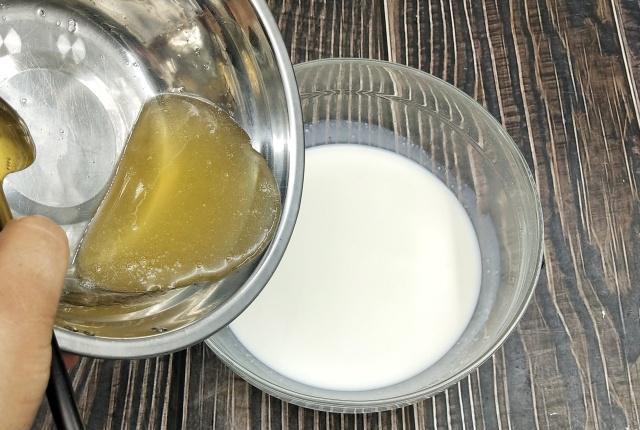 7、倒入牛奶中,边倒边将将其搅拌均匀,布丁液体就做好啦