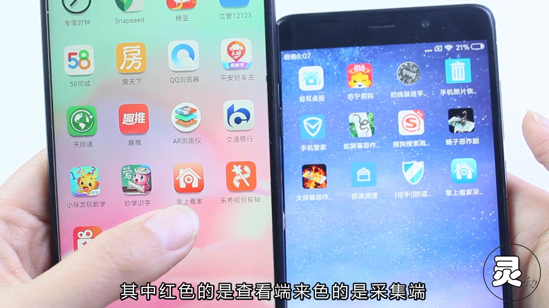 首先我们需要用到两部手机,我们在手机上找到掌上看家一个是红色的图标另一个手机上找到掌上看家采集端蓝色的图标,其中红色的是查看端蓝色的是采集端。