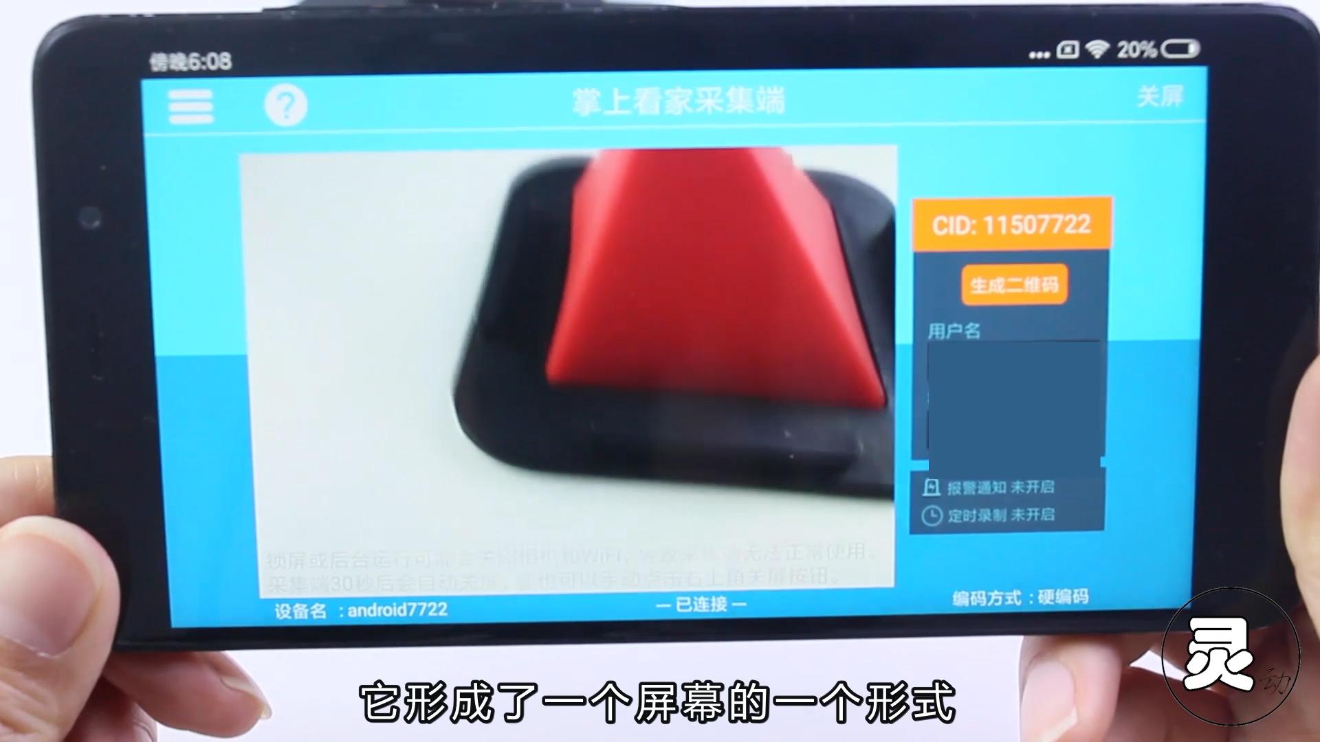 我们打开来看一下,首先我们打开采集端,打开之后是这样的一个界面,它形成了一个屏幕的一个形式。我们可以看到在右方有一个生成二维码我们通过查看端来连接一下,直接点击右上角的加号这里有二维码添加,它在这里就会显示在线我们点击,我们直接将采集端放在家中,我们可以看一下这样他就直接会显示我们家里的情况。