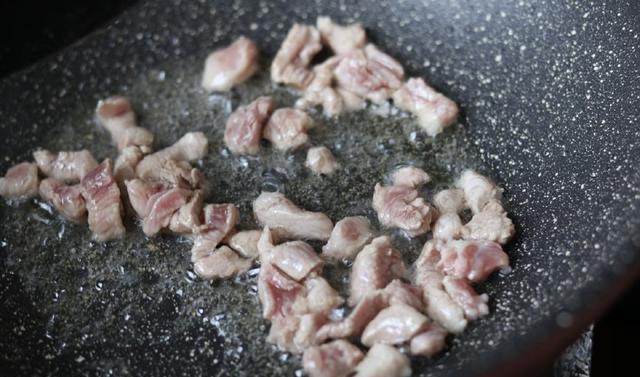 7、倒入猪肉条,快速翻炒变色,沿着锅沿加入少许热水。