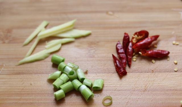 5、葱切圈,姜切丝。辣椒切丝,备用。