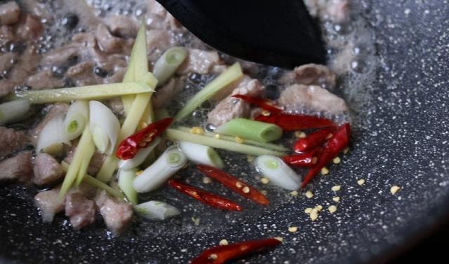 8、加入葱花、姜丝、辣椒,翻炒片刻。