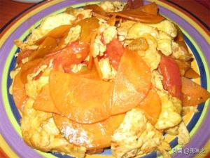 5、放放胡萝卜片炒2分钟,加入西红柿炒半分钟,放入烹好的鸡蛋翻炒。