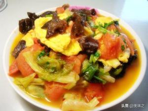西红柿3个、鸡蛋3个、生菜100克、木耳50克、葱10克、姜5克、蒜3瓣、花生油30毫升、料酒10毫升、盐5克、白糖5克、味精2克、香油5毫升。