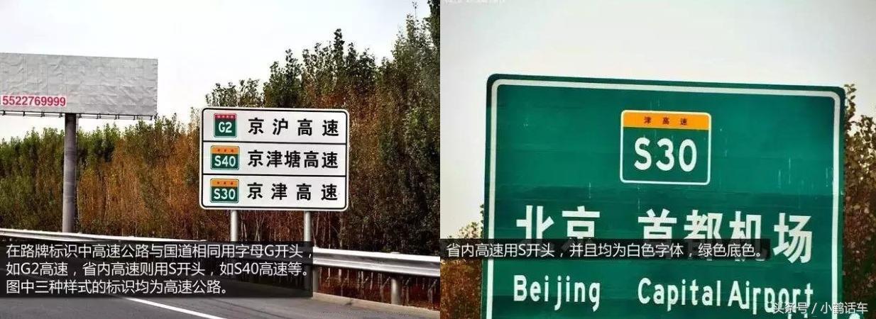 国内的高速路的标志字母和国道一样也是”G“,但不同点是,高速路的”G“标志是白字绿底。省内高速公路用”S“标志。其中国内和省内不同点是,国内高速上部有红色标志线,省内高速上部有黄色标志线。如下图所示: