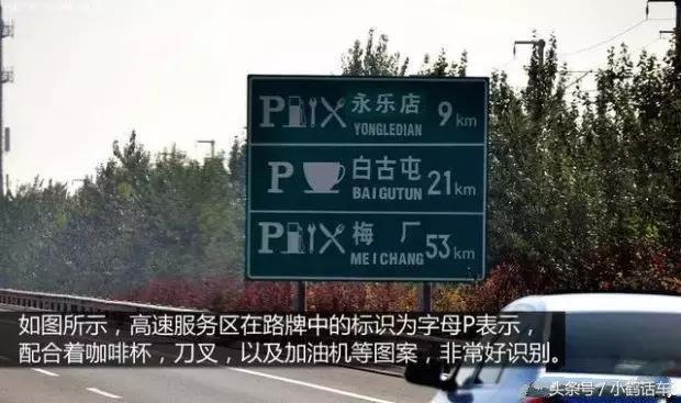 高速服务区的标志是”P“,在其旁边可能还伴有刀叉和咖啡杯等图案。如下图所示: