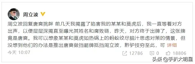 大家都知道的事情,周立波所说的唐爽是被背后的“某人”所收买,其不顾与周家五年交情,被一套房和十万现金收买,还是周立波为了明星地位割须弃袍,还是苦肉计蹭热点,我等吃瓜群众依然不得其解。
