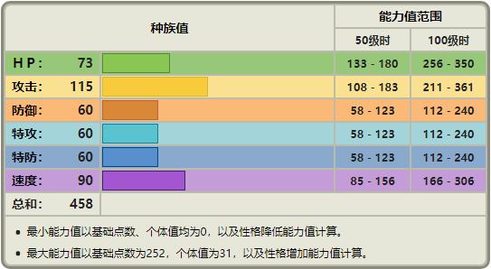 注:技能参照第七世代游戏技能表。技能里粗体字的招式为具有属性一致加成效果的招式。招式教学是可以通过招式教学习得。