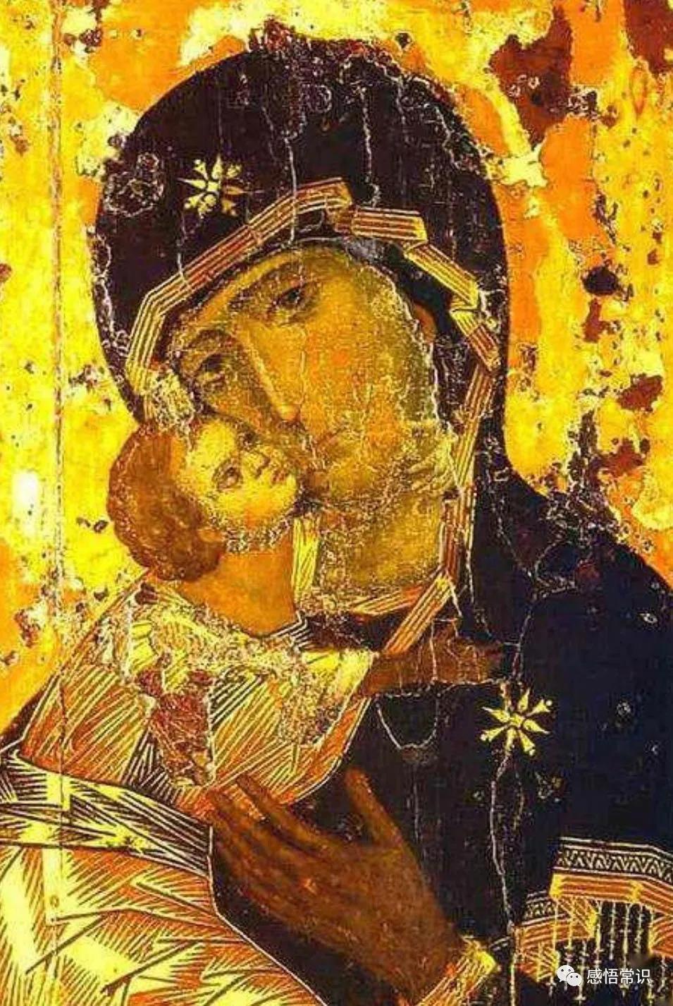 比如这幅《圣母子》,圣母和圣子沐浴在一片金色之中,这既让信徒们的心灵得到充盈,又彰显了圣母圣子的神性。