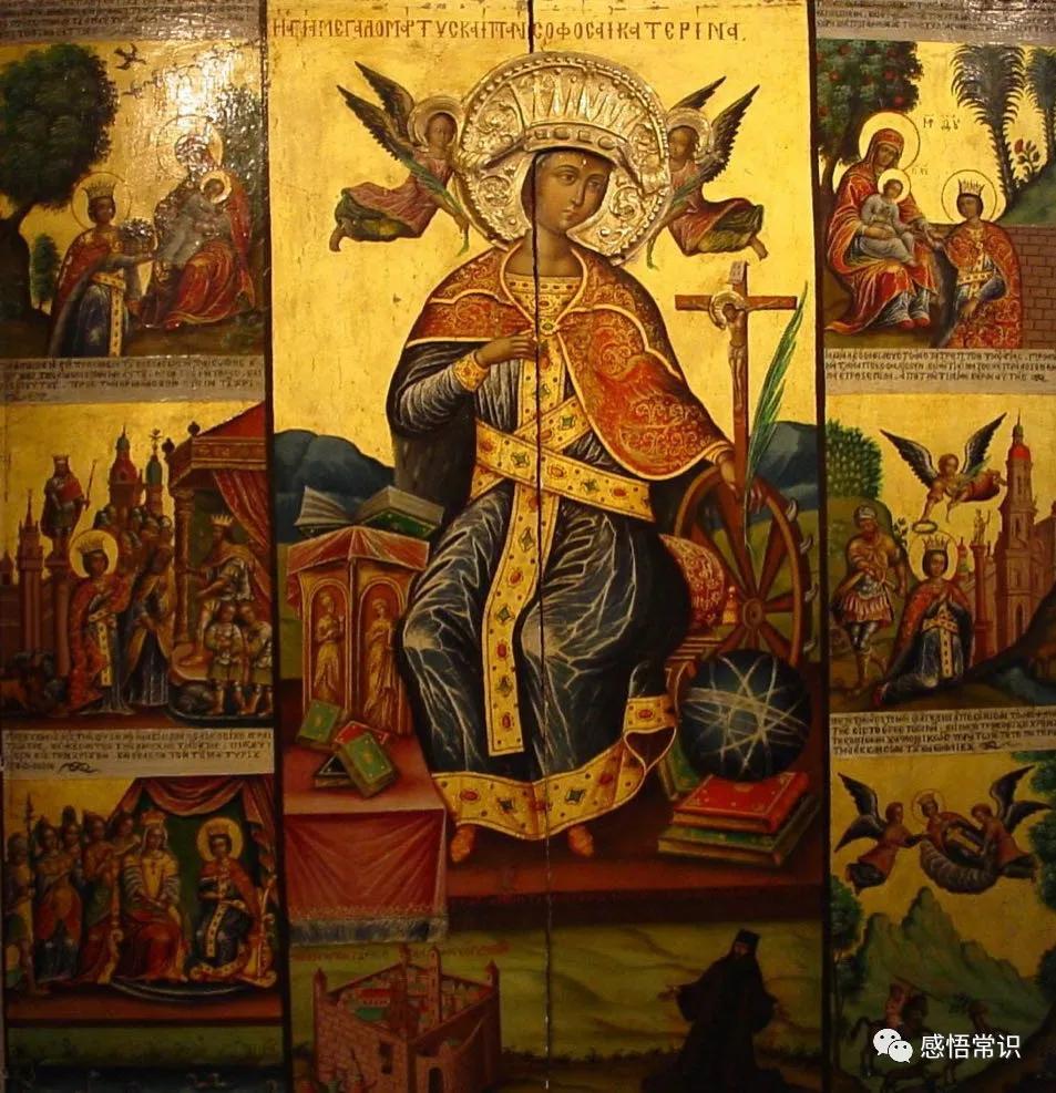 没办法,凯瑟琳死后,基督徒们把她的尸体运到西奈山脚下,在那里建了一座修道院,并且把她的形象画在了墙上。现实与教义就如此的矛盾。