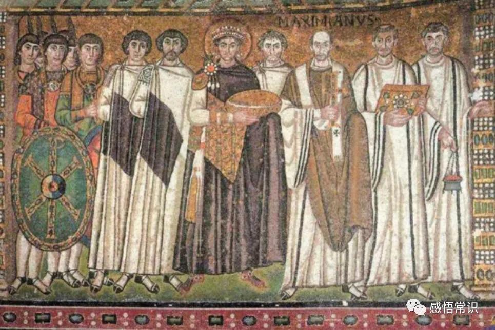 皇帝的右边是廷臣和卫士,左边是教士。这幅画中还有多个细节体现出拜占庭帝国皇权与教权的关系。