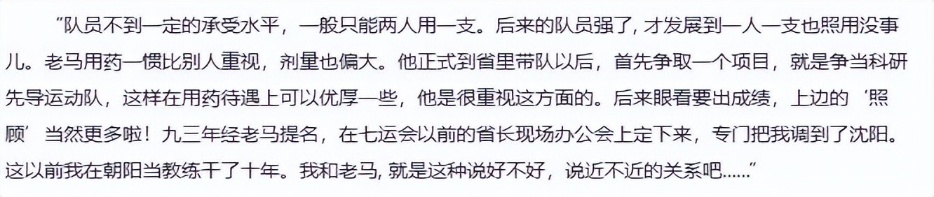 并袒露出,在每一次比赛前,马俊仁都会亲自为队员扎针注射兴奋剂,因为他对其他人都不放心。