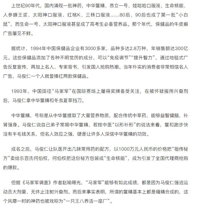 可好景并没有维持多久,在马俊仁跌落神坛之后,这款产品也受到调查,经过调查发现,这款产品从头到尾都是谎言,他们口中的“鳖精”只不过是用糖精勾兑而成的,压根没有任何功效。