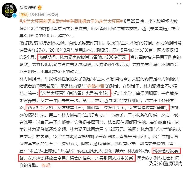 其前男友也于8月26日接受媒体采访时称,自己曾被“米兰大坏蛋”骗过300万,钱枫一定是被套路了。