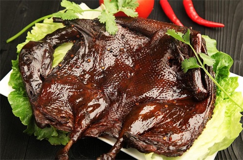 湖南酱板鸭是一道湖南常德的特色名菜。选材为本地特有的水鸭,是经三十多种名贵中药浸泡,10余种香料、经过风干、烤制等15道工序精致而成,成品色泽深红,皮肉酥香,酱香浓郁,滋味悠长,具有活血、顺气、健脾、养胃、美容之功效。