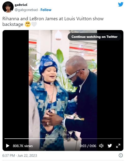 在路易威登时装秀上,詹姆斯和蕾哈娜再次相遇。这次相遇让人们感到惊喜和兴奋。他们互相拥抱时,詹姆斯用手掌轻轻地抚摸了一下蕾哈娜的肚子。这个孕肚是目前全球最著名的孕肚之一。