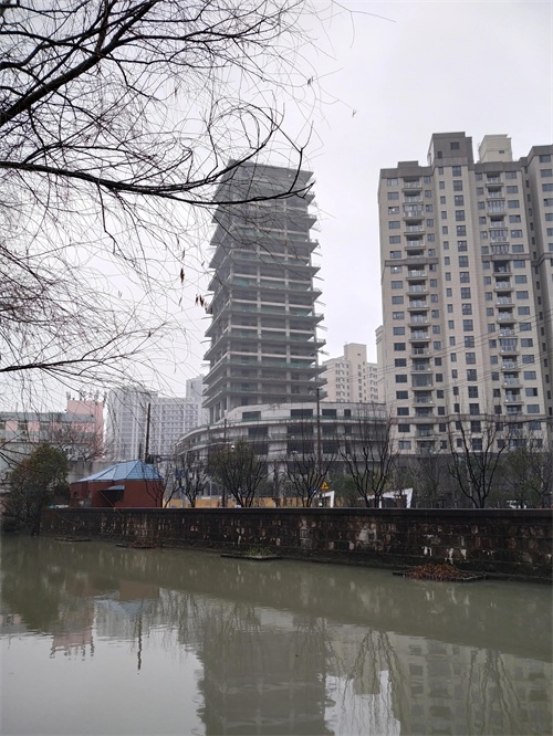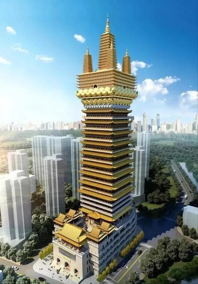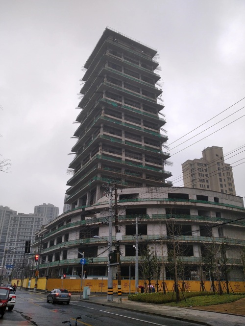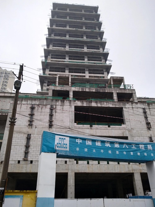 从现场的施工铭牌可以看到,该工程名为“太平报恩寺重建项目”,总包单位为中国建筑第八工程局。太平报恩寺建筑面积32240平方米,其中地面建筑24661.44平方米,地下建筑7578.56平方米,总高度173米,基本超过了周边的高层建筑,是国内乃至亚洲最高的寺庙。开工日期为2016年6月8日,竣工日期2018年12月8日,但现在已是2021年1月份了该工程至今尚未竣工。2019年下半年时还能看到有吊机和脚手架以及尚有零零散散的工人,去年下半年就什么也看不到了,只剩下一幢尚未完工钢筋外露孤零零的水泥建筑物了,从目前来看何时才能完工至今还是一个谜。