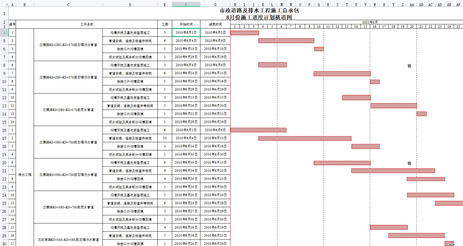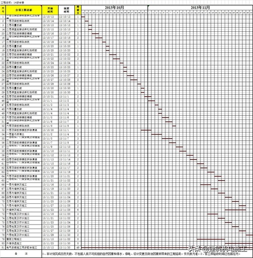 施工进度计划横道图编制小软件,包含了Excel和project两个版本,自带公式,在绘制横道图的时候,直接输入相关参数,就能自动生成施工红线,工期一目了然,不仅操作简单,还能打印预览,特别实用!