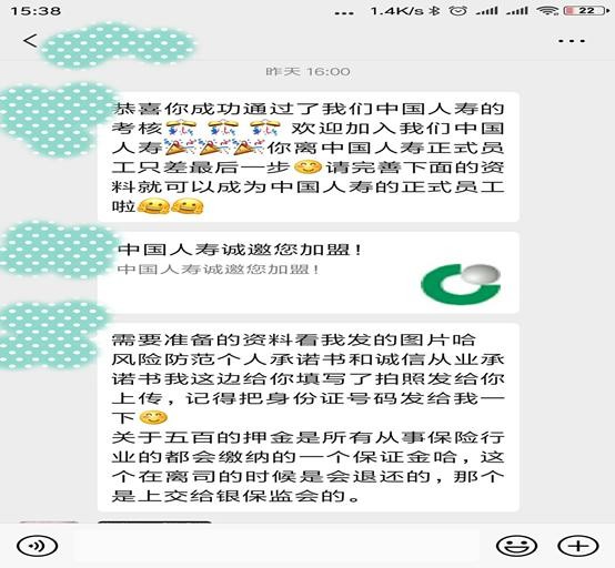 接着当天就有HR给我打了电话,在电话里只问了一个问题就是我了解保险吗?我会不了解,于是她就说我们公司有一个培训你听了这个培训之后会对保险有更深刻的认识巴拉巴拉,我以为这个实在面试前的培训并且没有需要我缴费,于是我就同意了参加培训。