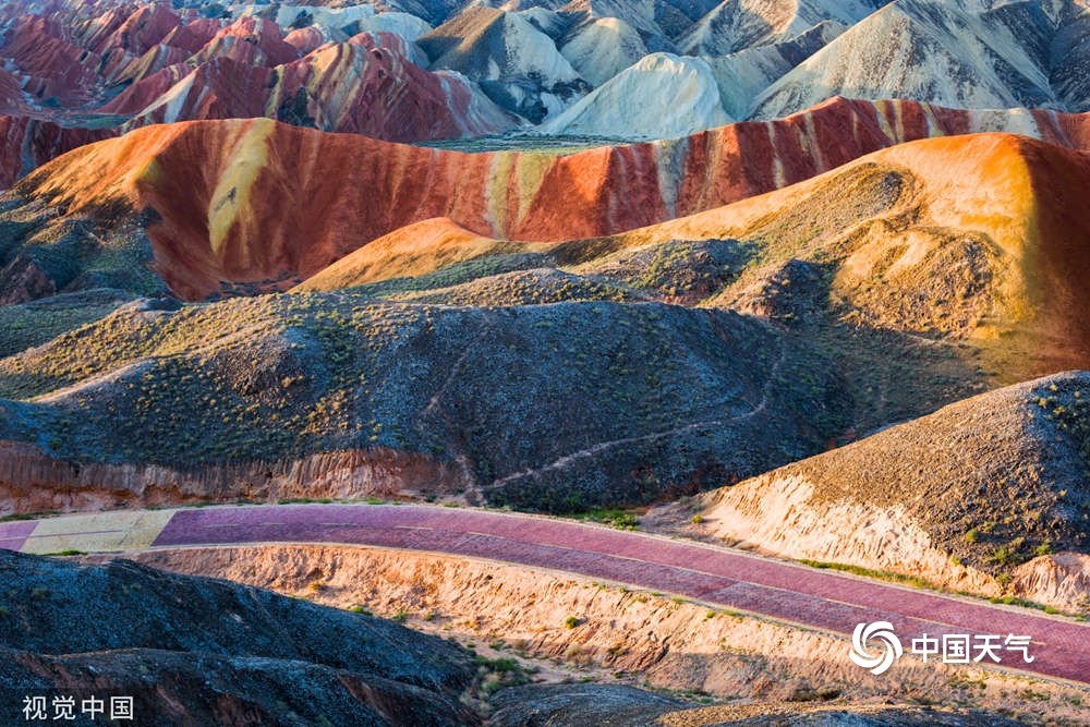 中国天气网讯 一组图带你一览祖国大美河山的春夏秋冬,每一张都是壁纸,在家也能云游祖国。图为2018年8月18日,甘肃张掖,七彩丹霞景观。(签约供稿人/视觉中国/版权图片 来源视觉中国)