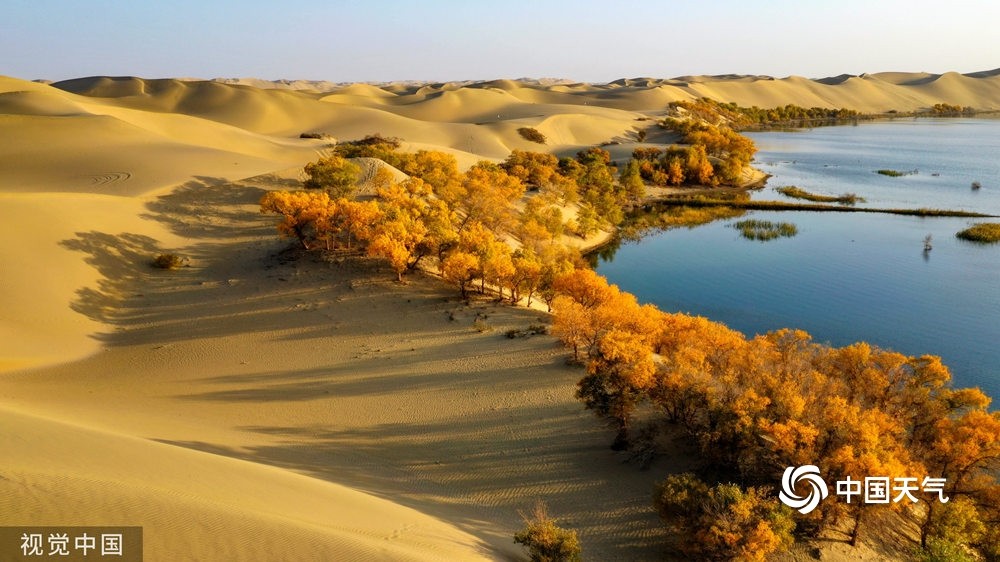 中国天气网讯 一组图带你一览祖国大美河山的春夏秋冬,每一张都是壁纸,在家也能云游祖国。图为2019年10月22日,新疆巴音郭楞蒙古自治州尉犁县罗布湖景区胡杨、沙漠相映生辉,秋景迷人。(李飞/视觉中国/版权图片 来源视觉中国)