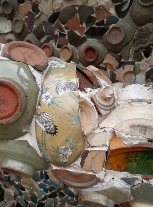 仔细看来,瓷房子里每个角落都是瓷器瓷片:屋顶上、栏杆扶手上、窗户框上、屋内的墙上的画上、灯罩上,甚至连排水管道外面也贴上了瓷器瓷片。如果你仔细观察会发现,每一片瓷片都是无比精美的,有的上面画上了花鸟的图案,有的是青花图案,有的是白瓷……破碎的瓷片拼接在一起,似乎它们也在诉说着自己的历史。
