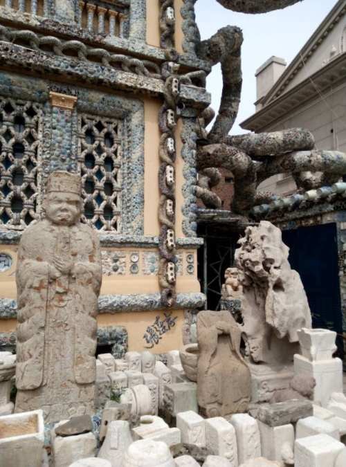 瓷房子里不仅有瓷器,还有很多石雕。有的被镶嵌在瓷房子的外墙上,有的则放在了墙角下。这些石雕大多已年代久远,也有部分残缺。与破碎的瓷片放在一起,没有任何违和感。石雕与瓷器相互衬托,更彰显了瓷房子的魅力。