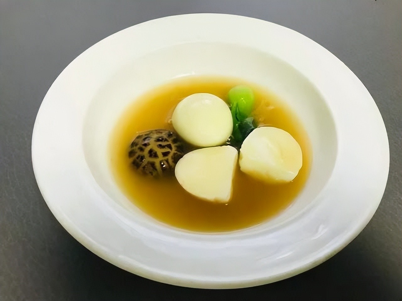 成品的花菇无黄蛋要蒸熟里面的食材,但是又不能让蛋清流出来。第一次吃的客人都以为是吃到了没有黄的鸡蛋,其实是提前准备好的蛋清加花菇等其他食材注入到空蛋壳里面蒸熟的。