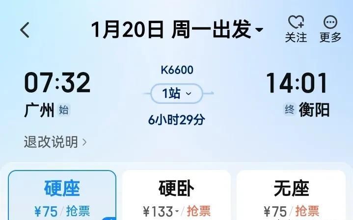 这趟列车从广州发车,早晨7:32准时鸣笛,6小时29分钟后稳稳停靠在衡阳站。沿途唯一的中途停靠点是韶关东。简单、直白,一条直线拉出广东到湖南的“快车道”。硬座75元,无座也是75元,硬卧133元,几乎是随便哪个务工人都能负担得起的价格,但别以为低价意味着轻松上车——票早就被抢得干干净净。有人熬夜刷票,有人托关系抢候补,连无座票也早早挂了“售罄”的牌子。