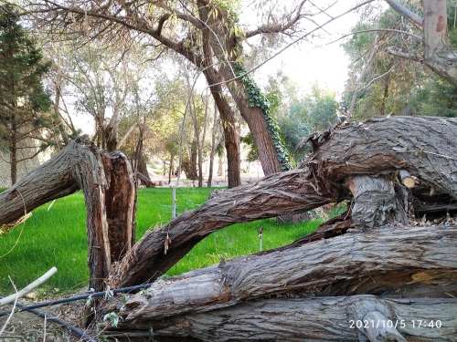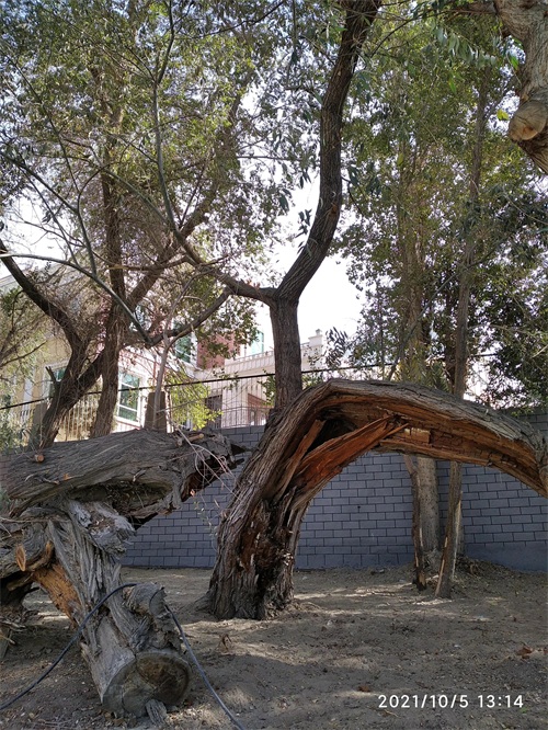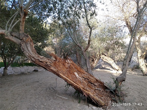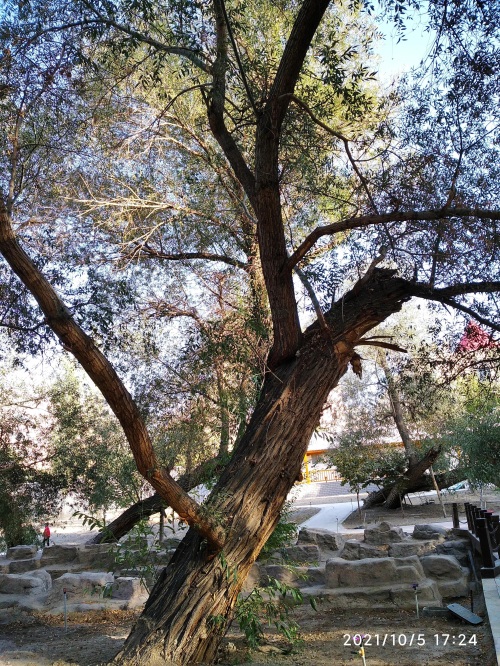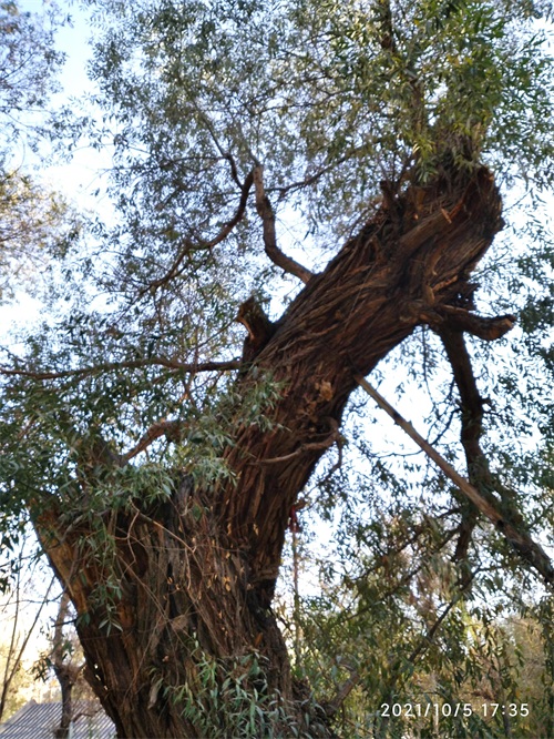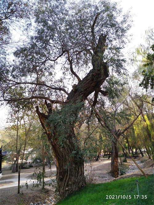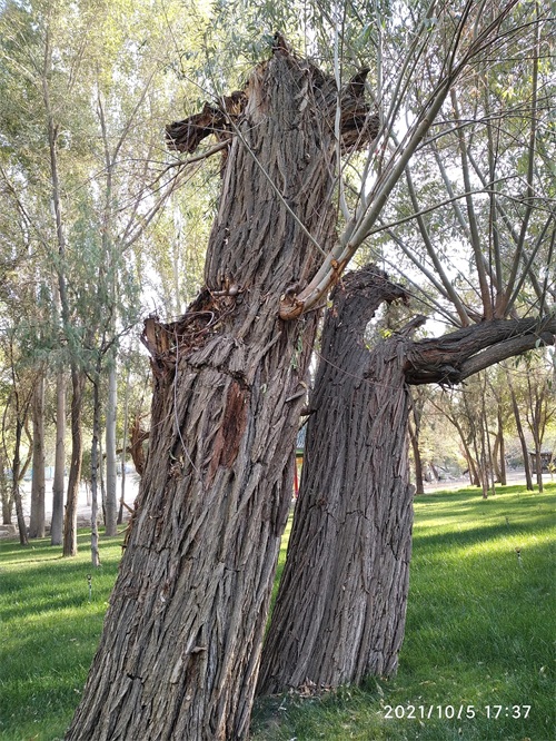 今天,在哈密人民公园内见到了左公柳,但是否是150年前左宗棠亲手所植已无从可查,但见一棵棵包含年轮,深之又深花纹的左公柳,诉说岁月如梭,曾经的沧桑;硕大的身躯,已支撑不住自己的身体,但它依然顽强挺立着,在讲述着曾经经历过的风吹雨打。
