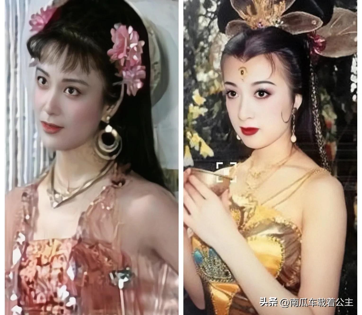 看二美对比照,头饰都戴得好夸张啊!一个是剧照,一个是舞台剧照,不过还是傅艺伟看着更漂亮,毕竟她当年饰演的妲己真的太漂亮了。
