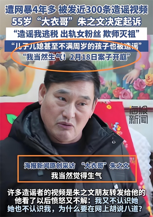 这不,隐忍四年的他终于还是坐不住了,大衣哥朱之文决定起诉长期造谣和抹黑他的人,并于2月18日开庭审理了。