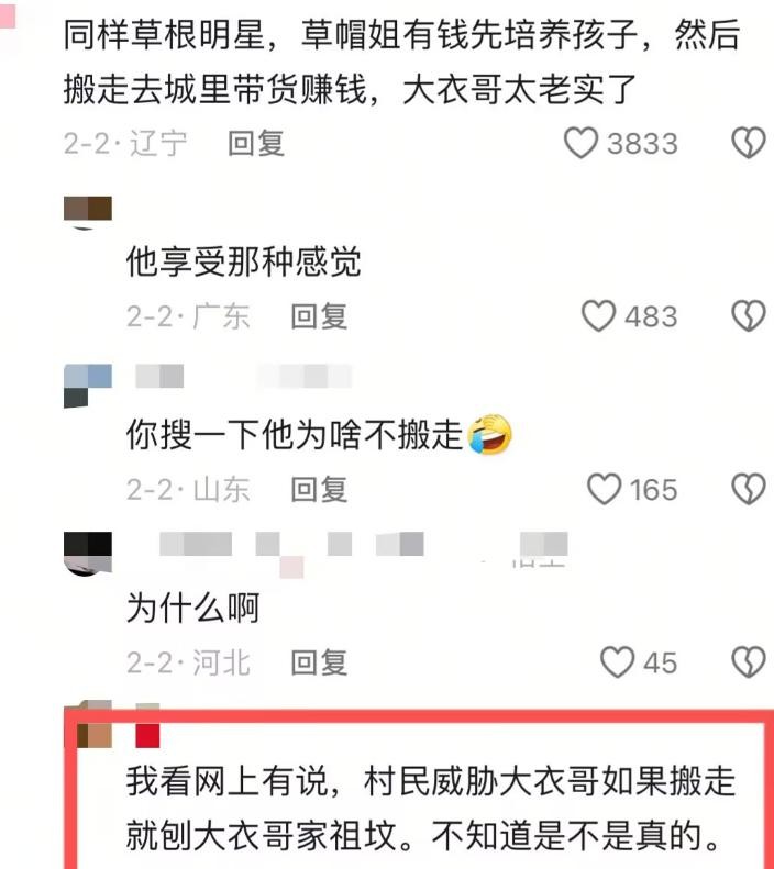 好多网友表示好奇,既然村里住的不舒服,天天被拍,借钱不还,24小时直播,这一切让大衣哥苦不堪言,那大衣哥为什么不搬出村子? 大衣哥对村子这么有感情的吗?理解不了,也解释不通。