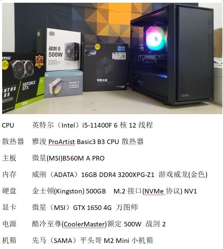这台i5 11400F配GTX1650入门电竞电脑主机预算达到在4000元左右,在1080P中高画质下,满足大多数的游戏需求.