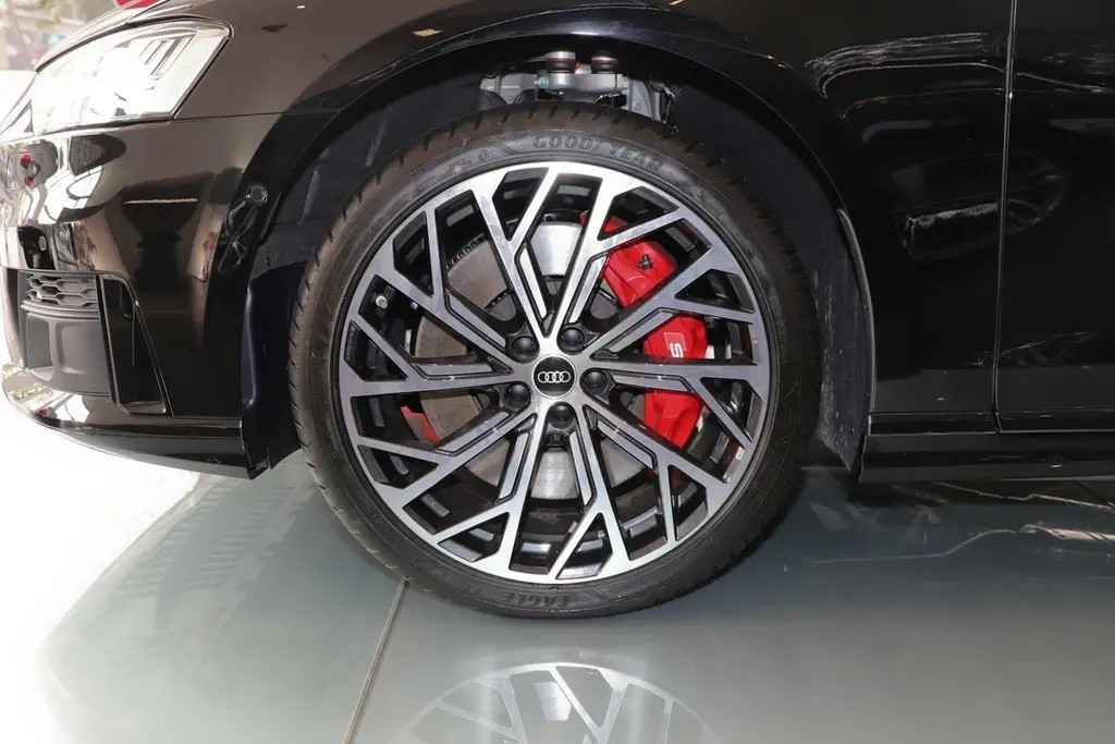 车身侧面,奥迪S8依旧延续了奥迪A8L的稳重大气,修长的线条以及镀铬装饰条提升了侧面的档次感。当然要说起奥迪S8侧面的设计亮点,主要表现在两个地方,其一就是奥迪性能车象征的银色外后视镜,其二则为红色涂装的前六活塞后双活塞的制动卡钳。前后轮胎规格方面,均为265/35 R21。