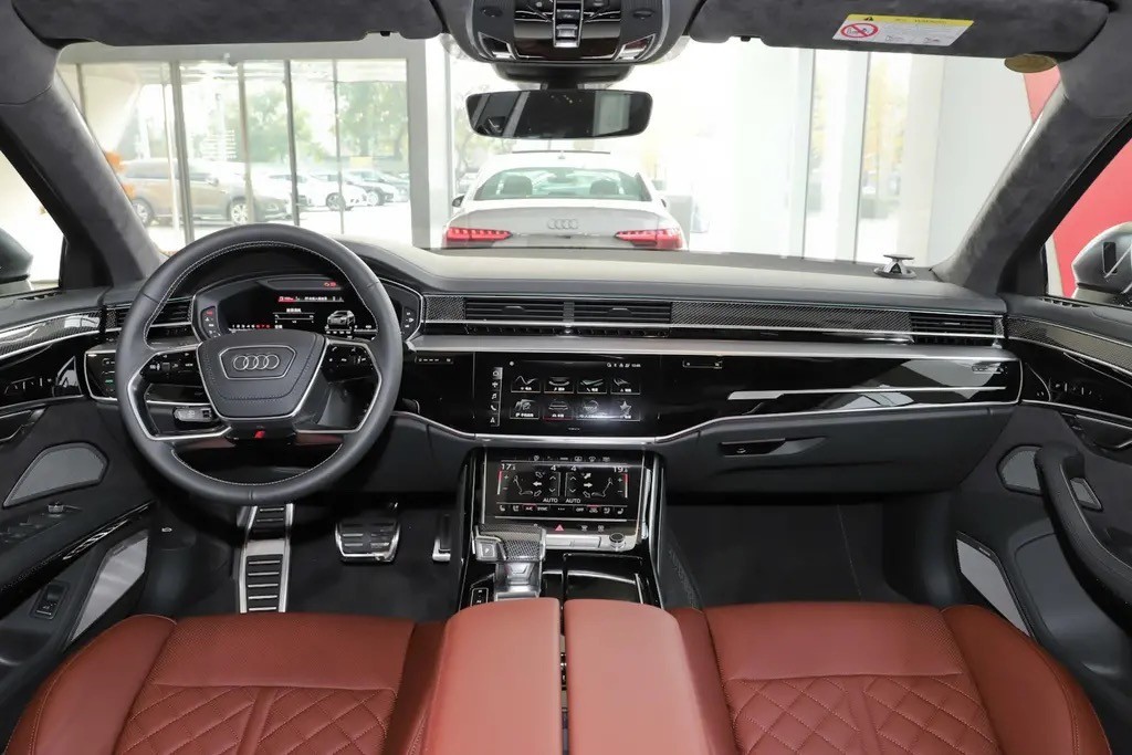 内饰方面,采用和奥迪A8L同款的中控设计,大气优雅成为了自身的主旋律,翻转设计的空调出风口,有着满满的仪式感。不过性能至上的奥迪S8在内饰用料上和奥迪A8L则有着较大的区别,中控台和门板处将碳纤维装饰板镶嵌其中,车顶还加入了Alcantara材质包覆,进一步提升了内饰座舱的运动性能属性。