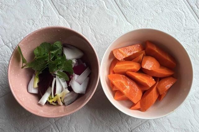 4:趁腌羊排的空档,把洋葱切月牙块,生姜切丝;胡萝卜切滚刀块,加橄榄油,少量盐拌匀腌制。