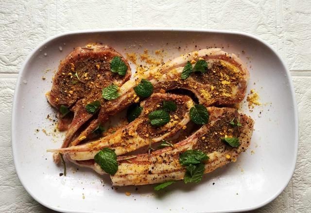 3:羊排放盘中,正反面均匀地撒上现磨黑胡椒,盐,原味烧烧粉,撕碎的薄荷叶,腌制20分钟。