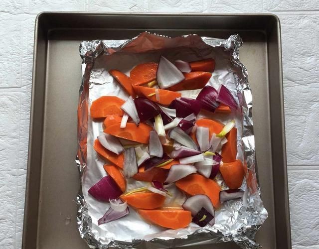 5:烤盘中摆上用锡纸折的盒子,先摆上洋葱,生姜丝,胡萝卜块。