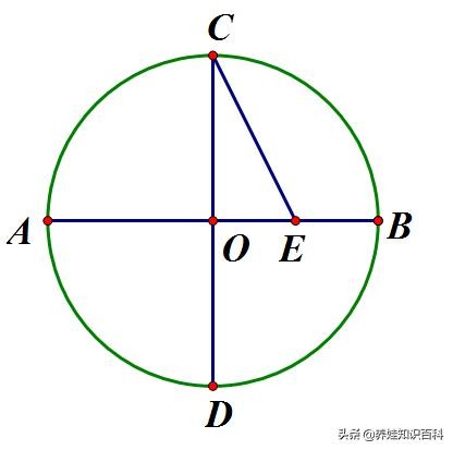 4、以E为中心点,以CE的长度为半径,画一个圆。在AO段上,会有一个相交的点,标记为F,连接CF。