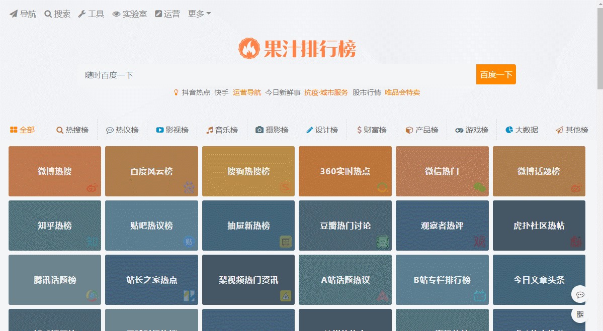 果汁排行榜是一个一键式快速查询各类排行榜的网站,包括了一些热搜、热议、电影、音乐、摄影、游戏、财富等各大领域权威排名榜单,非常方便我们增长知识。