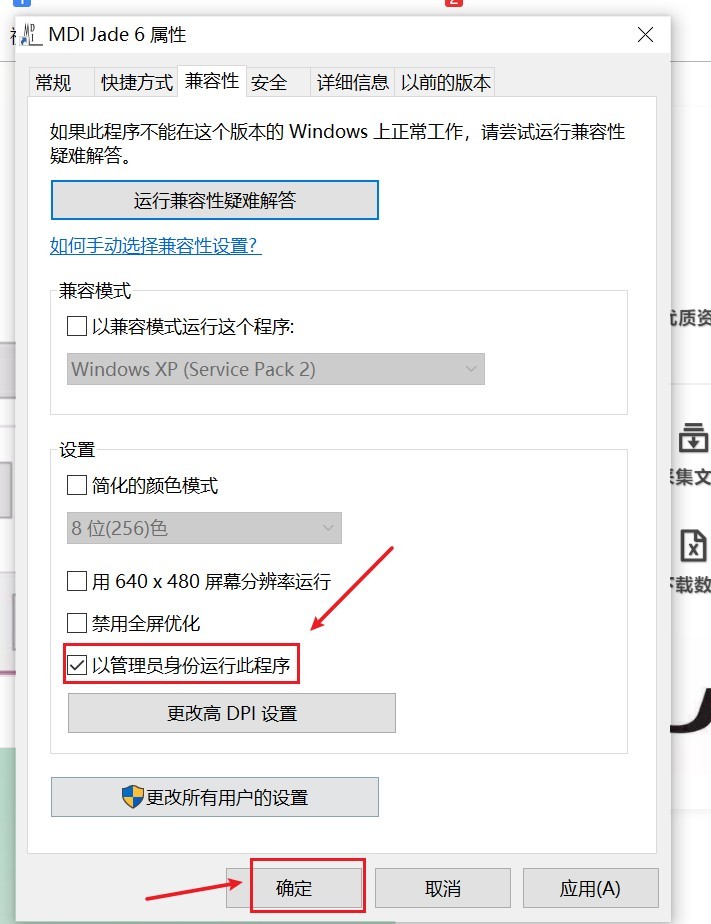勾选以管理员身份运行,点应用,最后确认。