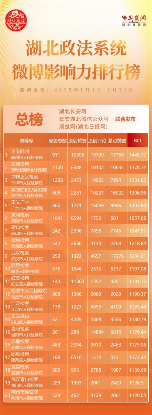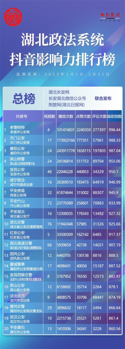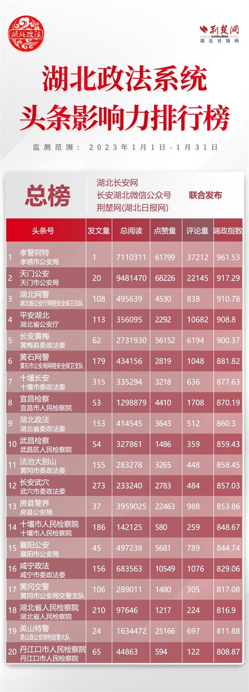 荆楚网(湖北日报网)讯(记者胡小军)2月13日,湖北省委政法委官网湖北长安网、官微长安湖北联合荆楚网(湖北日报网)、楚天舆情数据研究院发布湖北政法系统新媒体影响力排行1月榜单,黄冈政法系统多家单位入围。